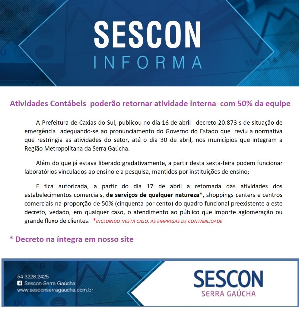 E fica autorizada, a partir do dia 17 de abril a retomada das atividades dos estabelecimentos comerciais, de serviços de qualquer natureza*, shoppings centers e centros comerciais na proporção de 50% (cinquenta por cento) do quadro funcional preexistente a este decreto, vedado, em qualquer caso, o atendimento ao público que importe aglomeração ou grande fluxo de clientes. *INCLUINDO NESTA CASO, AS EMPRESAS DE CONTABILIDADE.