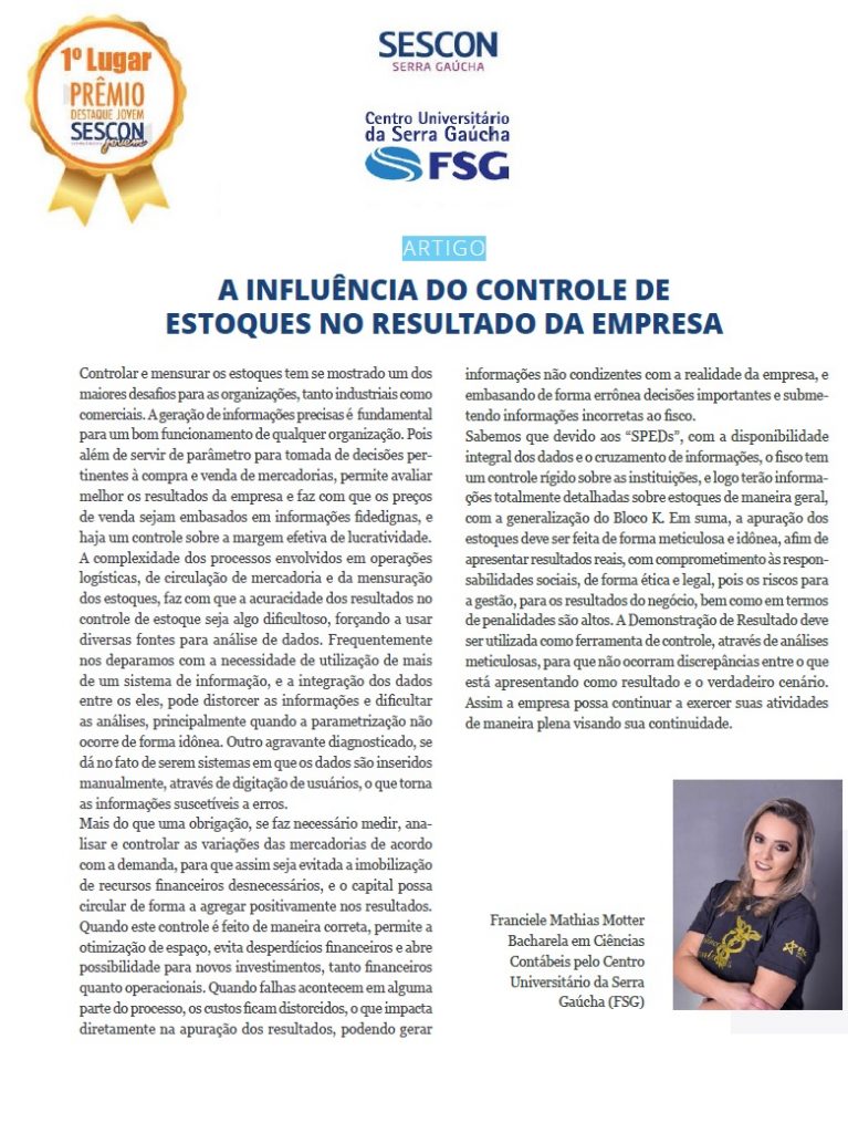 No segundo semestre de 2018 a vencedora da da FSG (Centro Universitario da Serra Gaúcha) foi Franciele Mathias Motter com o artigo “ A influencia do controle de estoques no resultado da empresa”.