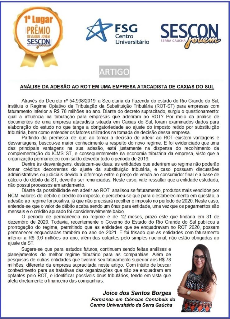 Joice dos Santos Borges com o artigo “ ANÁLISE DA ADESÃO AO ROT EM UMA EMPRESA ATACADISTA DE CAXIAS DO SUL”