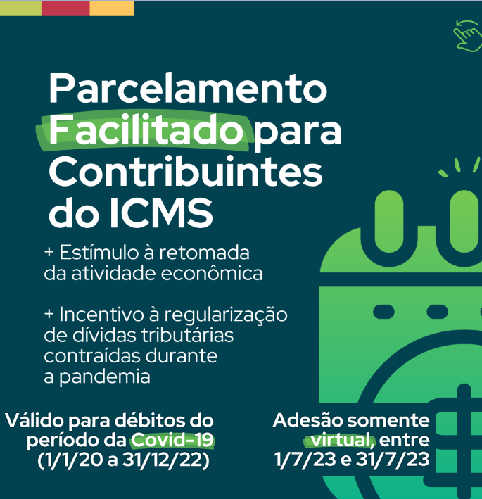 Buscando estimular a retomada da atividade econômica e incentivar a regularização de dívidas tributárias contraídas durante a pandemia, a Receita Estadual e a Procuradoria-Geral do Estado estão disponibilizando condições especiais de parcelamento do ICMS devido. A medida é válida para os débitos declarados vencidos no período de 1º de janeiro de 2020 a 31 de dezembro de 2022. A adesão e o pagamento da parcela inicial devem ser feitos entre 1º e 31 de julho de 2023.