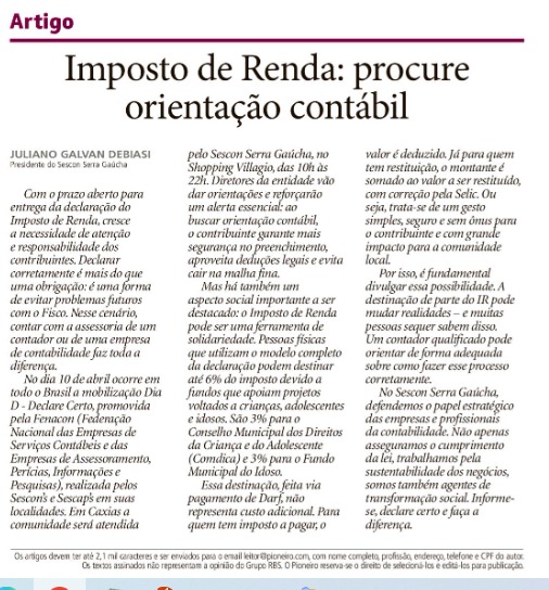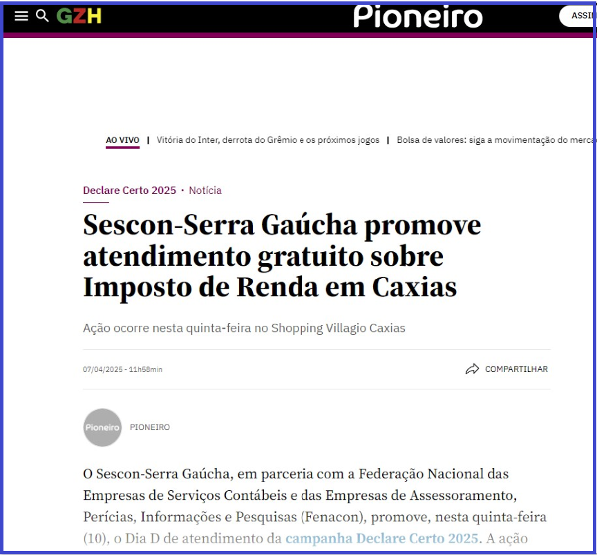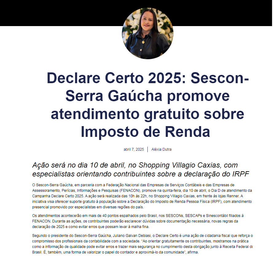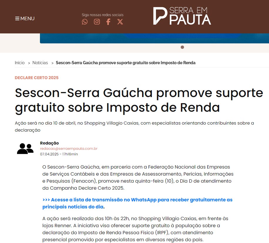 Para esclarecer todas as dúvidas dos contribuintes, o Sistema FENACON realizará ainda o Dia D de Atendimento em 10 de abril. Os 40 SESCAPs, SESCONs e Sinescontábil promoverão ações coordenadas em todo o Brasil, e o Sescon Serra Gaúcha engajado nesta ação tão importante vai estar no Shopping Villagio em Caxias do Sul nesta data das 10h as 22h em frente as lojas Renner.