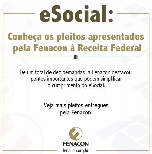 De acordo com a entidade, o governo federal não tem investido na divulgação maciça do eSocial, com campanhas publicitárias e informativas. O intuito dessa divulgação, explica a Fenacon, é auxiliar as organizações contábeis a conquistarem a adesão dos seus clientes aos processos do eSocial, em especial as micro e pequenas empresas.